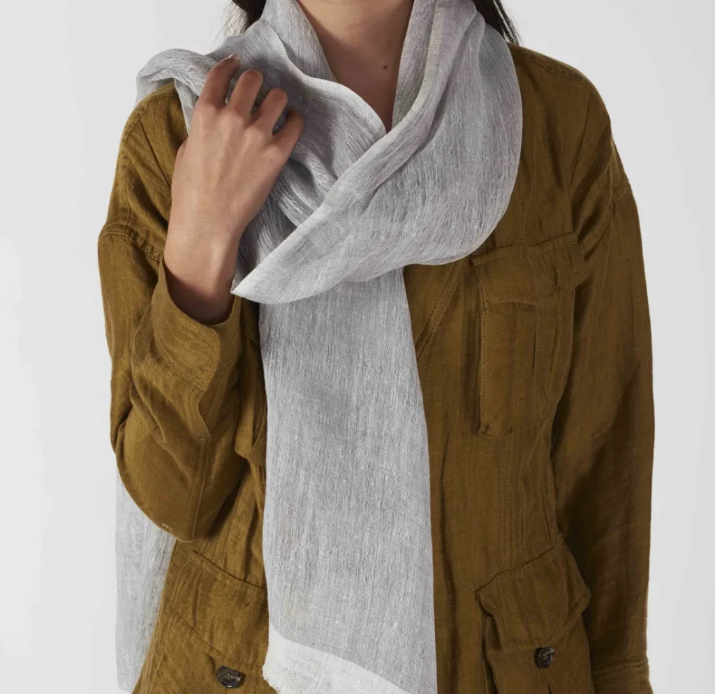 The Telba scarves and shawls are made from imported Belgian flax fibers that Sabahar imports and then weaves on traditional looms. The shawls feature a raw edge trim.