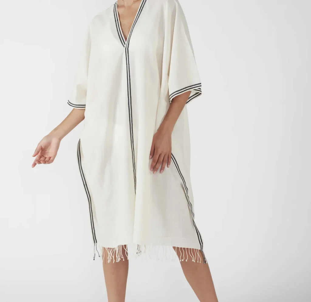 The Adina shawls are pure white linen with a pop of color in evenly spaced thin lines. Wear these as a light summer shawl or an autumn scarf.