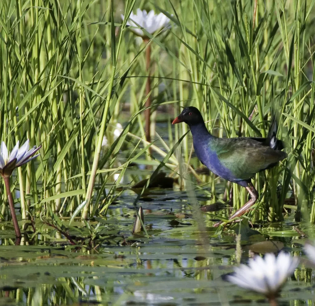 Boasting shimmers of navy blue and green, the Lesser Gallinule is a small waterbird often found in marshes and lakes. Its fondness for wetlands makes it a common bird sighting in Botswana.