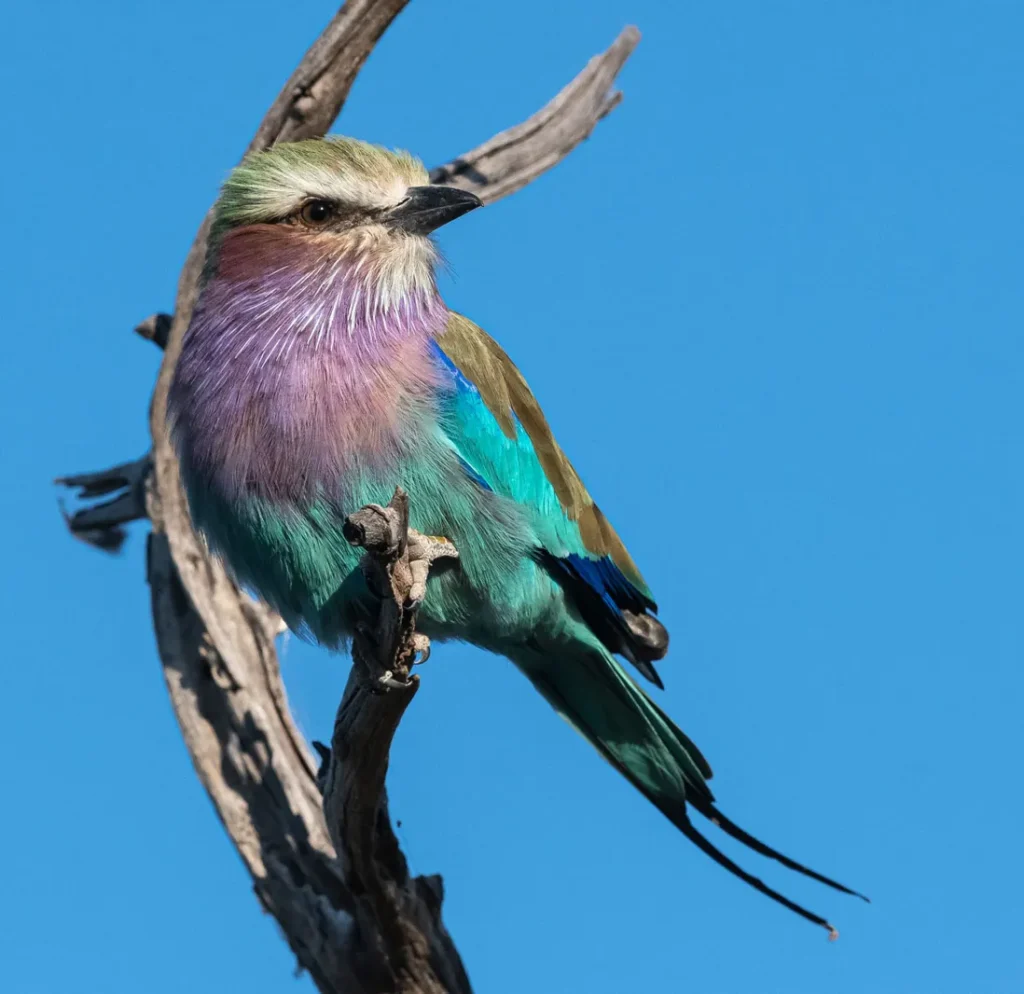 Often found in pairs, the Lilac Breasted Roller is a frequent sighting in the more woodland regions of the Moremi Game Reserve. From high vantage points, they can spot insects, lizards, snails, and other creatures to feast on.