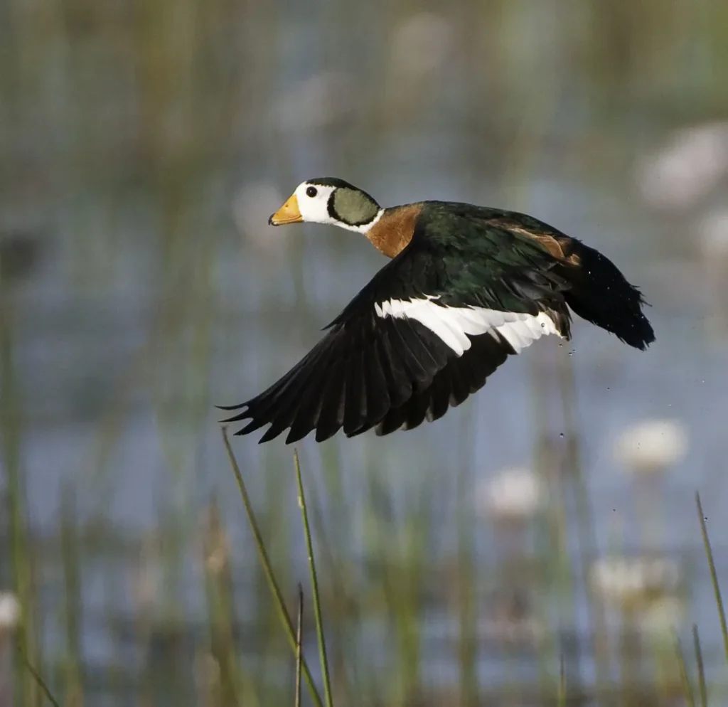 Favouring tranquil wetlands, the Pygmy Goose is often found residing across the Okavango Delta during the rainy seasons, flaunting a spectacle of black, white, green, and amber.