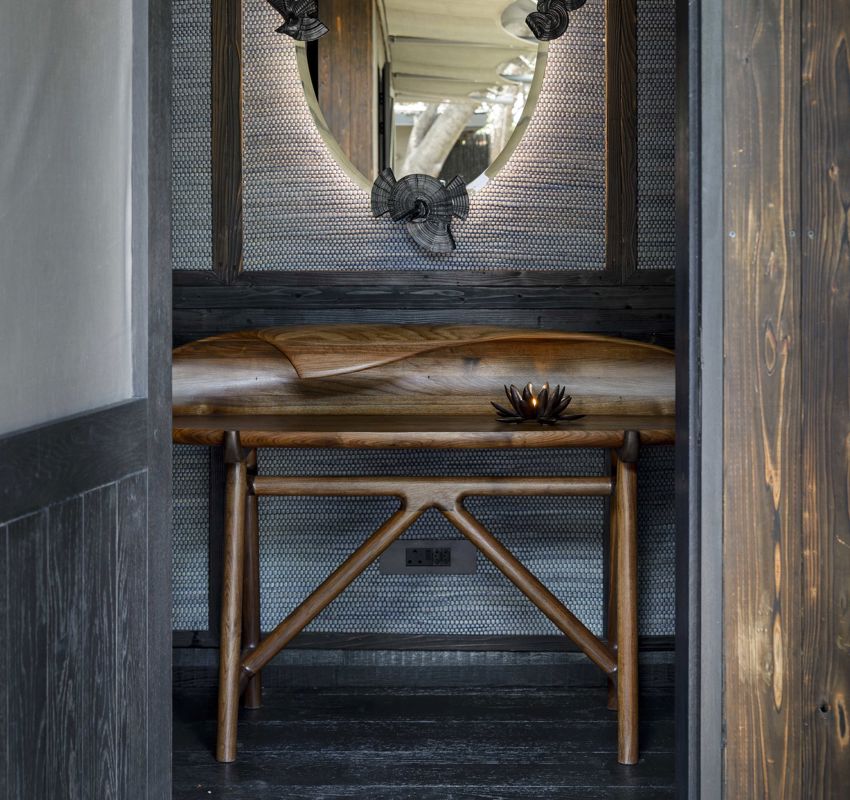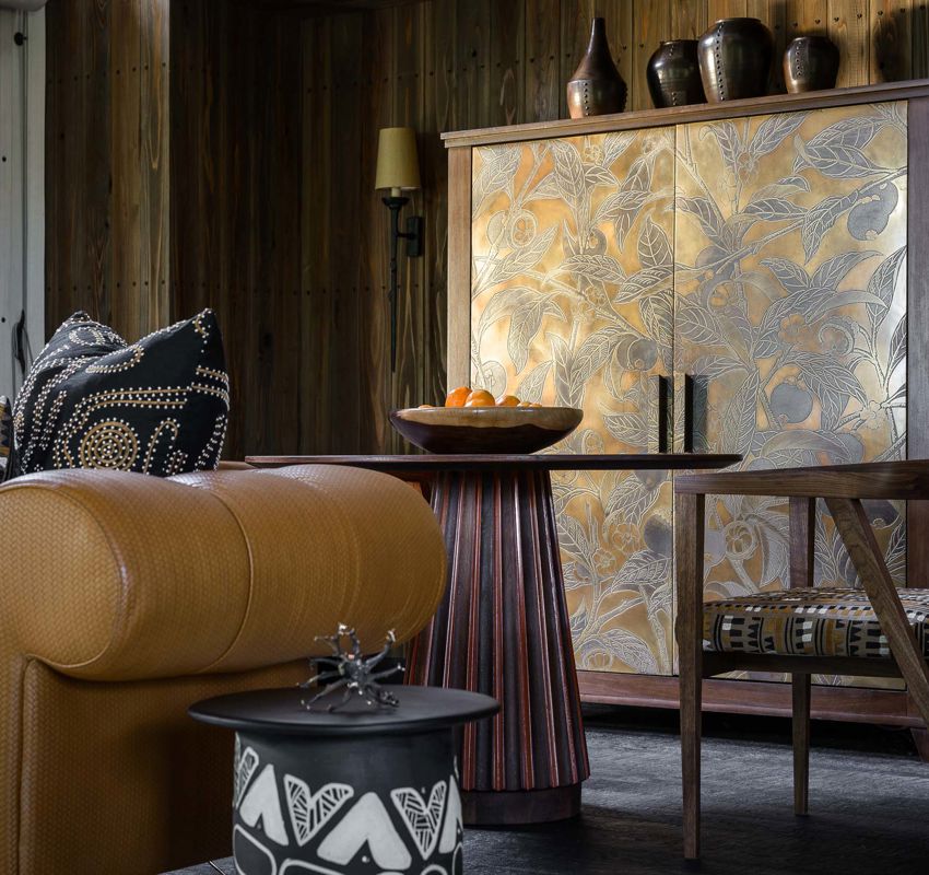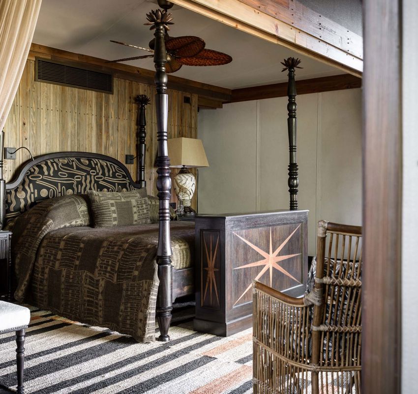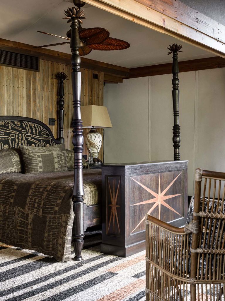 The African mangosteen is a richly emerald evergreen tree, beloved throughout the Okavango Delta for its life-giving fruits. Its colours are reflected in the suite's African Jacquard custom bedspread and ebonised kiaat and bronze bed.