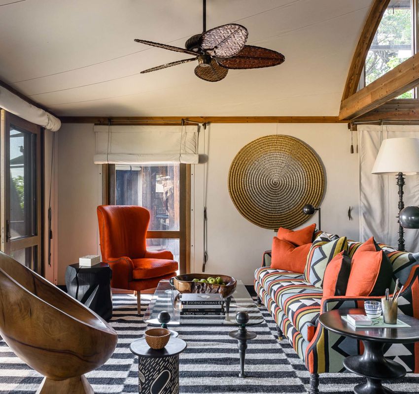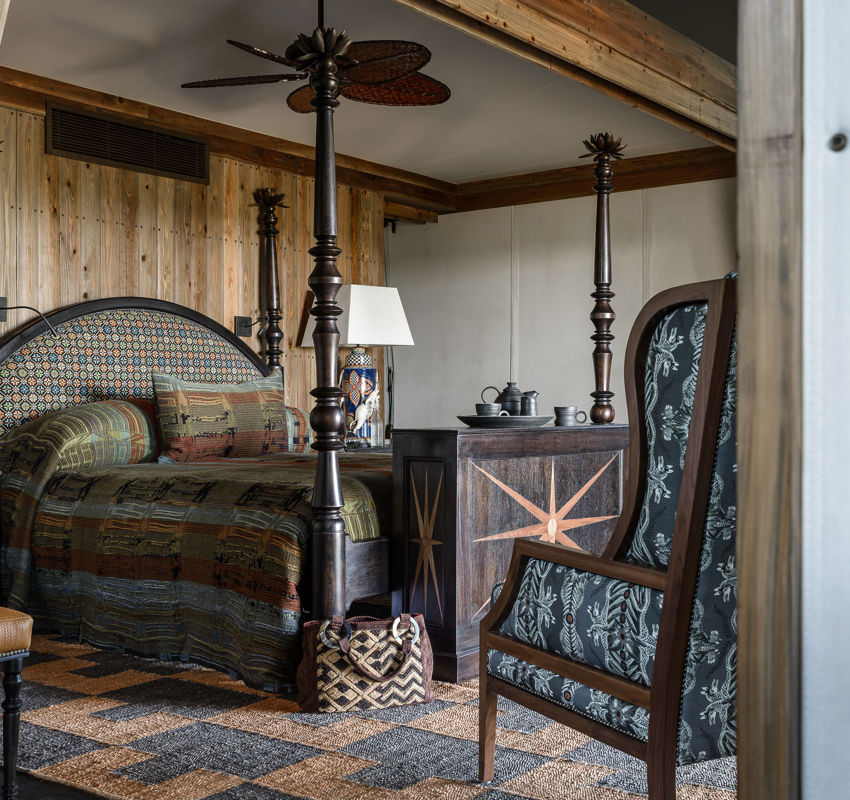 A favourite among the giraffes and elephants that roam the Delta, the marula tree is one of Africa's botanical treasures. The suite's design is inevitably spectacular, from the unique egg cup chair by Adam Birch to the three-stripe karakul by Coral & Hive.