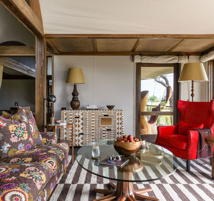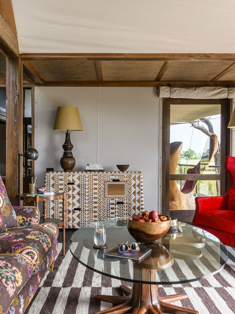 Taking design and colour palette inspiration from the delicate waterlilies that are the emblem for Xigera, this suite is both intricate and calming, exemplified by the walnut and white custom Kassena Server, with geometric patterns derived from two literary texts in the Sotho and Tsonga languages.